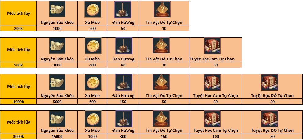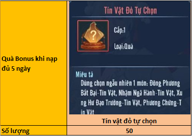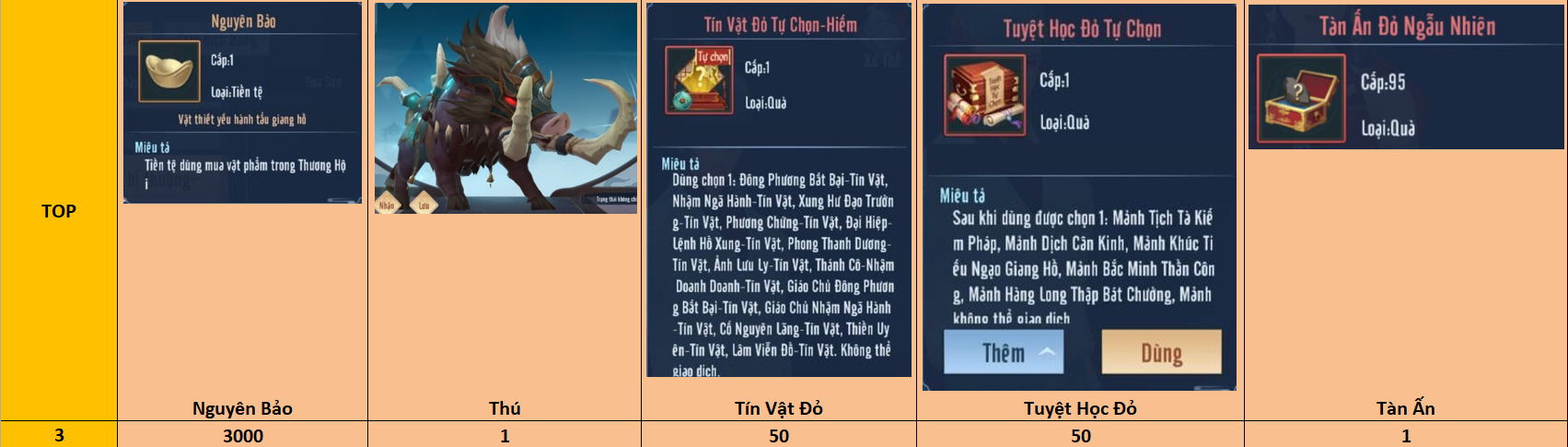 Top 3: 3000 Nguyên Bảo; Thú cưỡi Ngạo Mạn - Vĩnh Viễn *1; Tín Vật Đỏ Tự Chọn - Hiếm (Như hình) *50; Tuyệt Học Đỏ Tự Chọn (Như hình) *50; Tàn Ấn Đỏ Ngẫu Nhiên *1