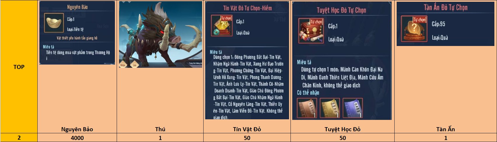 Top 2: 4000 Nguyên Bảo; Thú cưỡi Ngạo Mạn - Vĩnh Viễn *1; Tín Vật Đỏ Tự Chọn - Hiếm (Như hình) *50; Tuyệt Học Đỏ Tự Chọn (Như hình) *50; Tàn Ấn Đỏ Tự Chọn *1