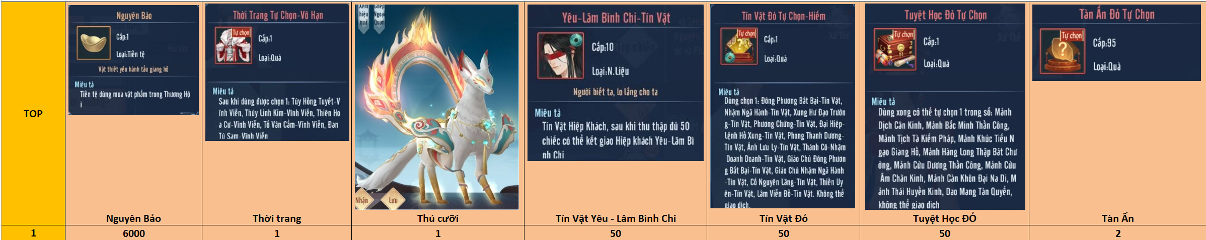 Top 1: 6000 Nguyên Bảo; Thời Trang Tự Chọn - Vô Hạn (Như hình) *1; Thú cưỡi Linh Tiêu Khách - Vĩnh Viễn *1; Yêu - Lâm Bình Chi - Tín Vật *50; Tín Vật Đỏ Tự Chọn - Hiếm (Như hình) *50; Tuyệt Học Đỏ Tự Chọn (Như hình) *50; Tàn Ấn Đỏ Tự Chọn *2