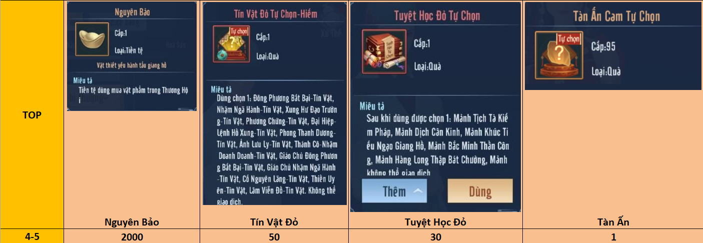 Top 4-5: 2000 Nguyên Bảo; Tín Vật Đỏ Tự Chọn - Hiếm (Như hình) *50; Tuyệt Học Đỏ Tự Chọn (Như hình) *30; Tàn Ấn Cam Tự Chọn *1