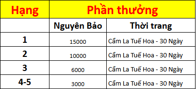 *Thể lệ: Khi kết thúc thời gian sự kiện, top 5 người chơi có điểm cao nhất của Bảng xếp hạng "Hoa Sơn Luận Kiếm" sẽ nhận được phần thưởng.