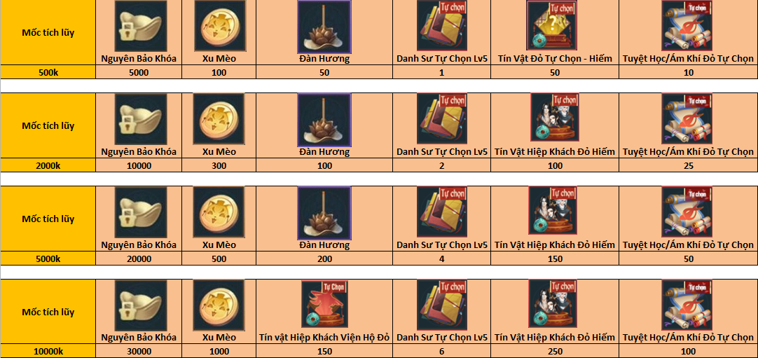 - Trong thời gian diễn sự kiện, các Đại Hiệp NẠP TÍCH LŨY đạt tới mốc nào sẽ nhận quà mốc đó