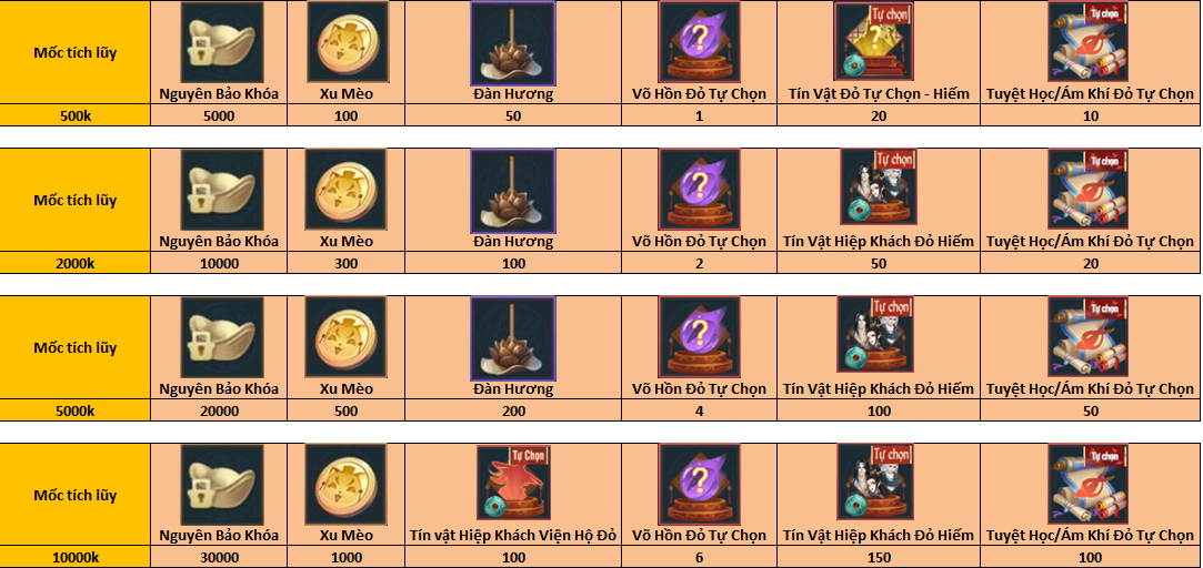 - Trong thời gian diễn sự kiện, các Đại Hiệp NẠP TÍCH LŨY đạt tới mốc nào sẽ nhận quà mốc đó