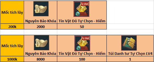 - Mốc 1000k: 8000 Nguyên Bảo Khóa, 100 Tín vật đỏ Tự Chọn - Hiếm, 1 túi Danh Sư tự chọn lv4